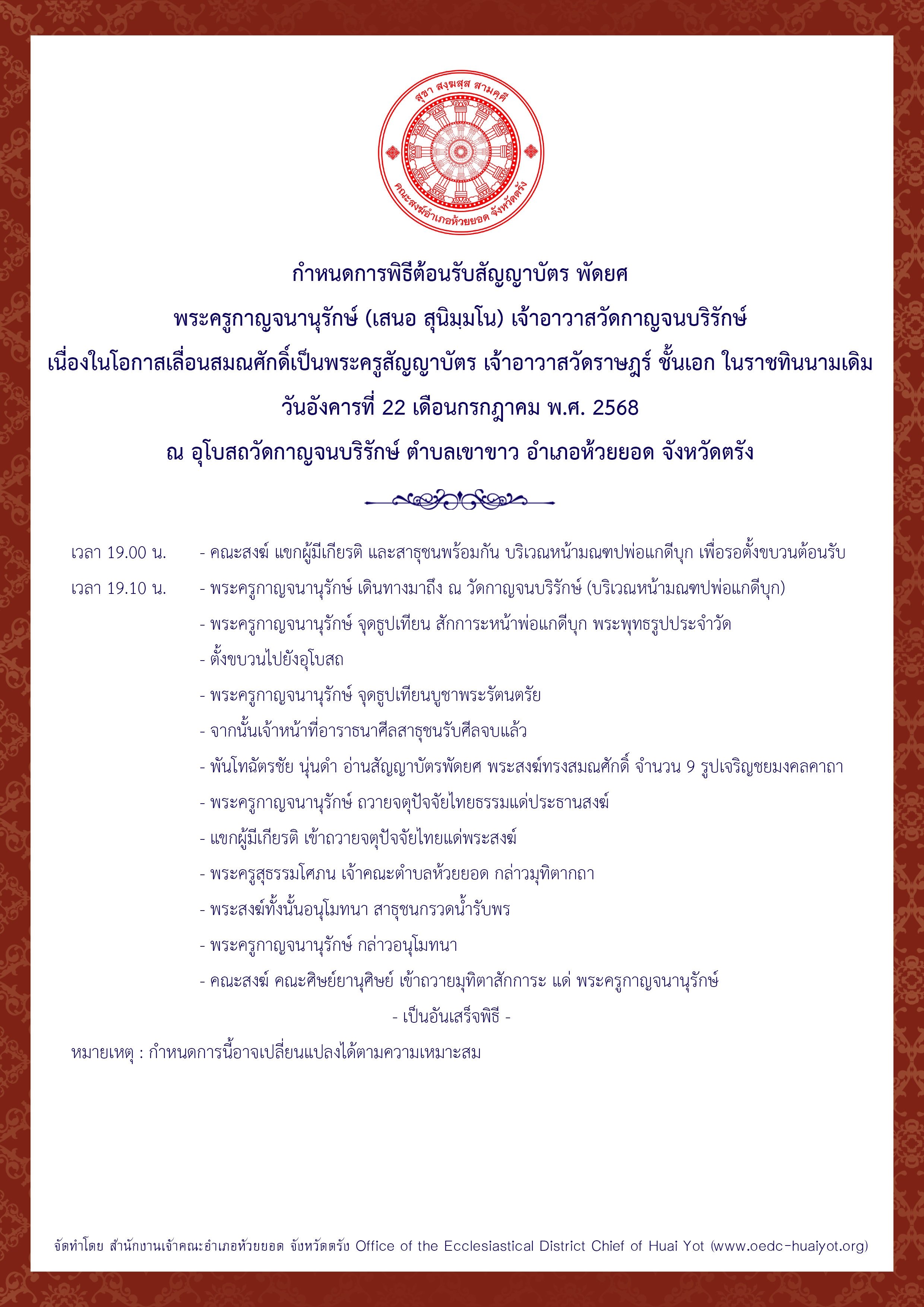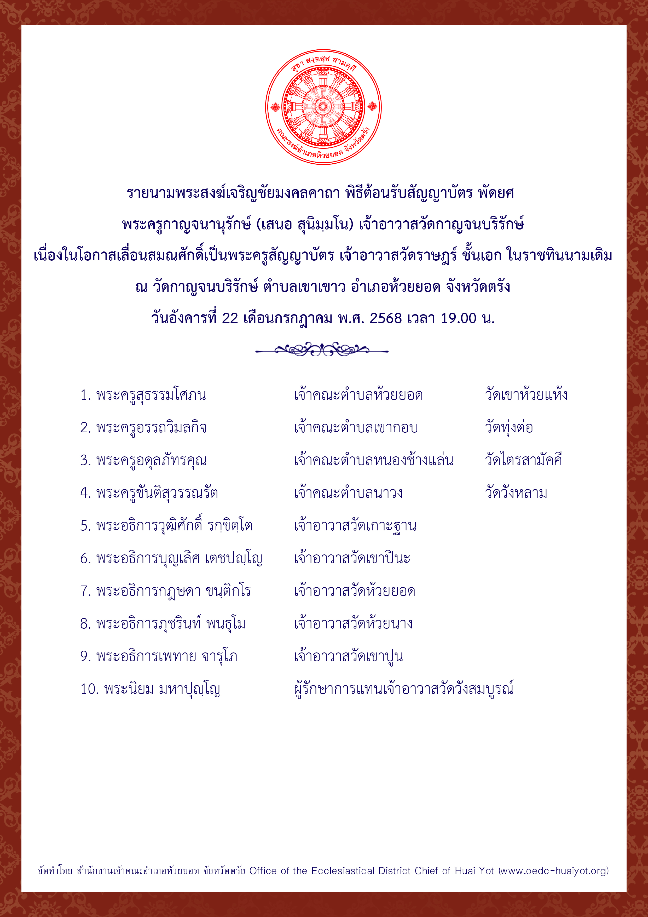 พิธีต้อนรับสัญญาบัตร พัดยศ พระครูกาญจนานุรักษ์ (เสนอ สุนิมฺมโน) เจ้าอาวาสวัดกาญจนบริรักษ์ เนื่องในโอกาสเลื่อนสมณศักดิ์ เป็นพระครูสัญญาบัตร เจ้าอาวาสวัดราษฎร์ ชั้นเอก ในราชทินนามเดิม ณ อุโบสถวัดกาญจนบริรักษ์ ตำบลเขาเขาว อำเภอห้วยยอด จังหวัดตรัง วันอังคารที่ ๒๒ เดือนกรกฎาคม พ.ศ. ๒๕๖๘