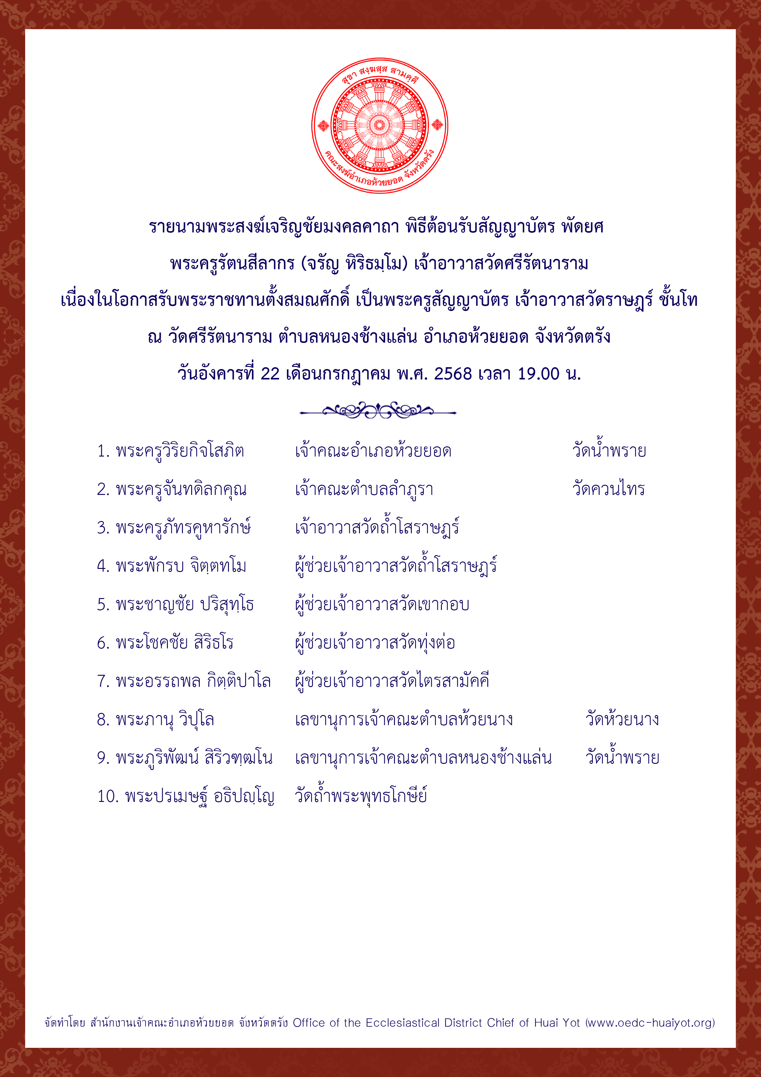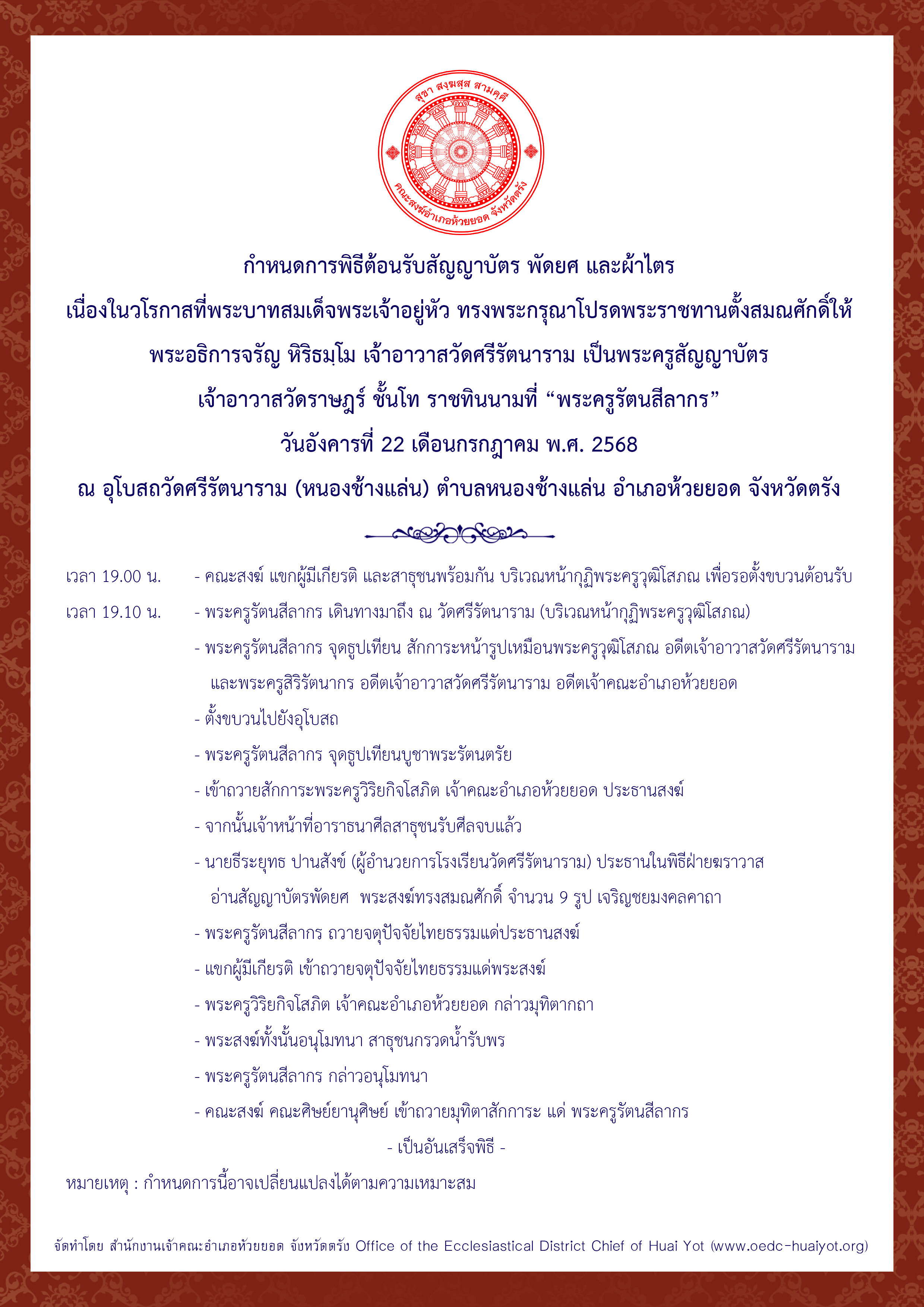 พิธีต้อนรับสัญญาบัตร พัดยศ พระครูรัตนสีลากร (จรัญ หิริธมฺโม) เจ้าอาวาสวัดศรีรัตนารามเนื่องในโอกาสรับพระราชทานตั้งสมณศักดิ์ เป็นพระครูสัญญาบัตร เจ้าอาวาสวัดราษฎร์ ชั้นโท ณ อุโบสถวัดศรีรัตนาราม ตำบลหนองช้างแล่น อำเภอห้วยยอด จังหวัดตรัง วันอังคารที่ ๒๒ เดือนกรกฎาคม พ.ศ. ๒๕๖๘